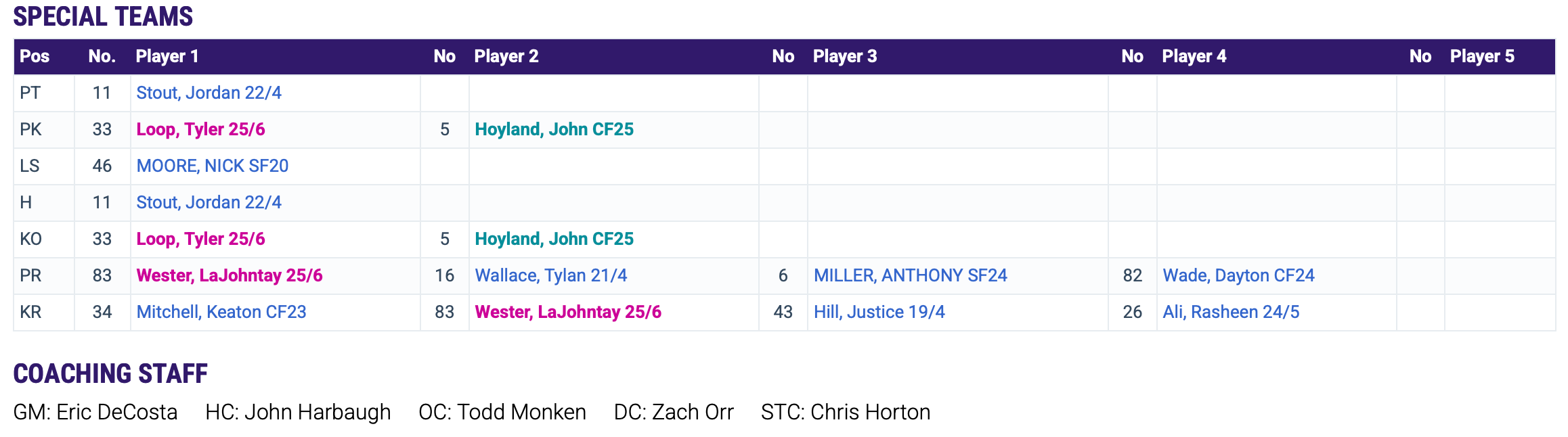 Owner: Stephen Bisciotti || General Manager: Eric DeCosta || Head Coach: John Harbaugh || Offensive Coordinator: Todd Monken || Defensive Coordinator: Zachary Orr || Special Teams: Chris Horton