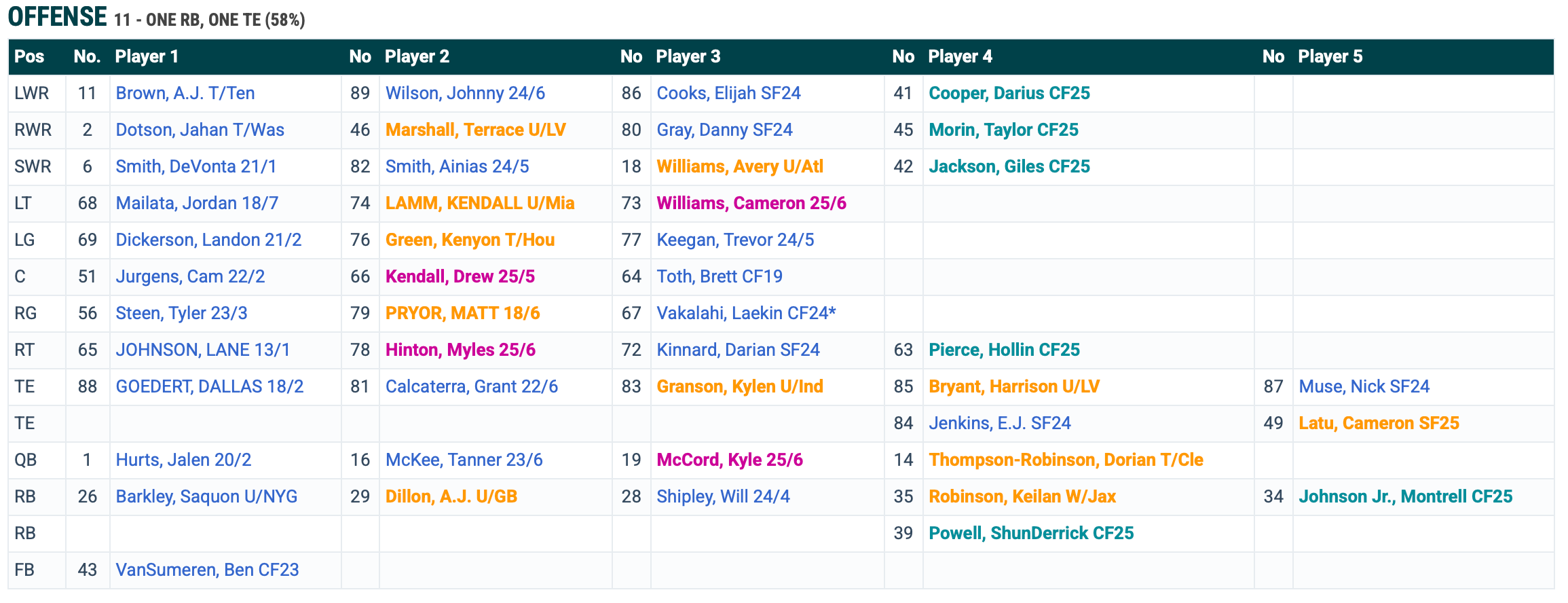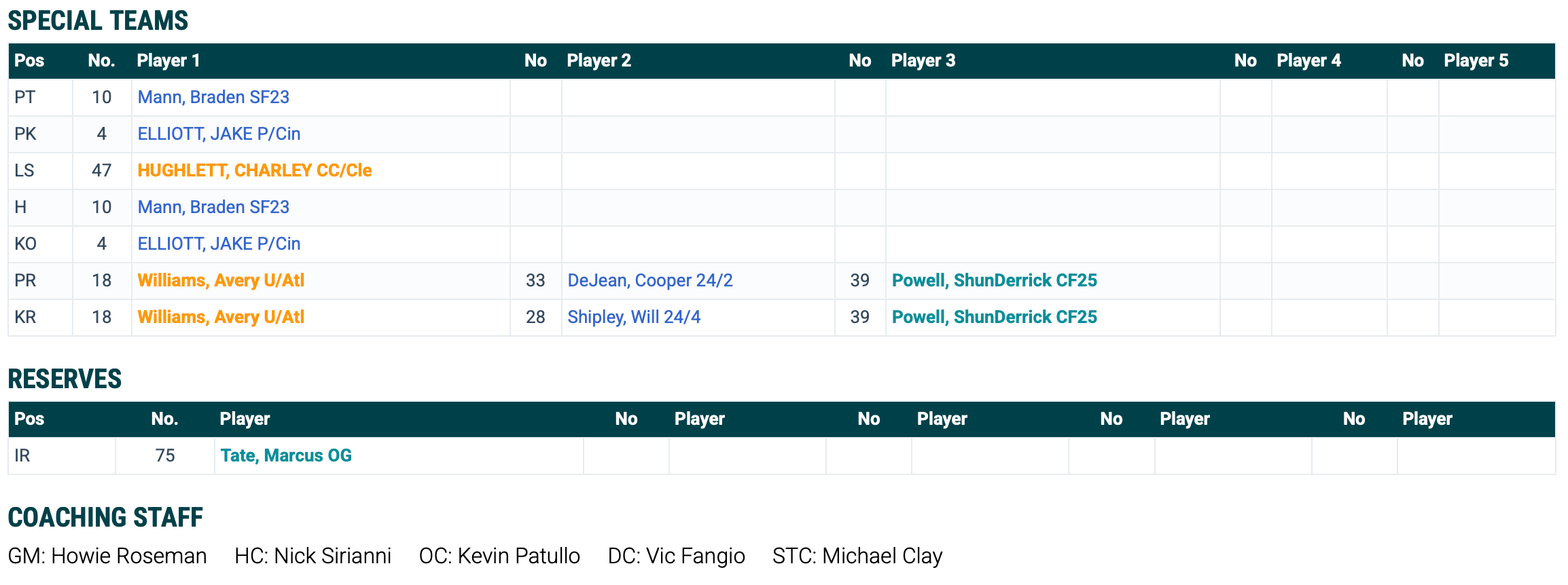Owner: Jeffrey Lurie || General Manager: Howie Roseman || Head Coach: Nick Sirianni || Offensive Coordinator: Kevin Patullo || Defensive Coordinator: Vic Fangio || Special Teams: Michael Clay