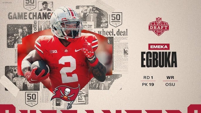 Rd.1 No.19. Emeka Egbuka, WR, Ohio State — Look for the polished Egbuka to make an instant impact. As a refined route runner who plays with a physicality who will fit right in with Tampa, he should find quick success. (photo: Tampa Bay Buccaneers)