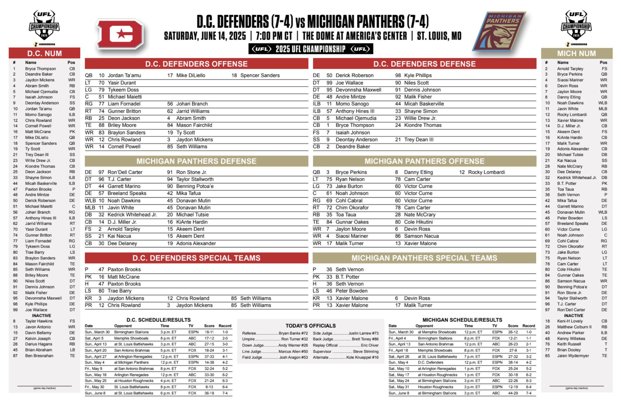 The United Football League will hold the 2025 UFL Championship Game, presented by Underdog on Saturday, June 14, at 8pm ET at The Dome at America’s Center in St. Louis. The championship will feature a matchup of the USFL Conference Champion Michigan Panthers against the XFL Conference Champion DC Defenders.