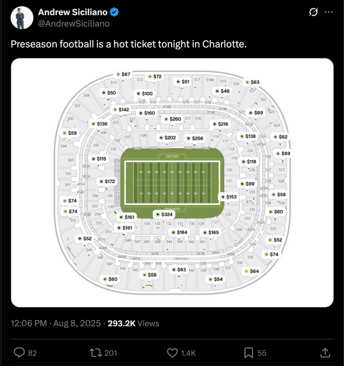 Last week in Nashville, we got a first-hand look at number one overall pick Cameron Ward at Tennessee Titans training camp. While Ward was chosen first overall, his rookie counterpart Shedeur Sanders had to wait until the Cleveland Browns selected in the fifth round at pick No.144. At this juncture a year ago and for most of the season, Ward and Sanders were often connected at the hip when it came to who the top signal-caller of the 2025 NFL Draft would be. Since then, their paths have been distinctly different journeys, which has been captivating to watch. After the 411-mile trek from Nashville-to Charlotte, there was plenty of buzz surrounding Bank of America Stadium upon our arrival, as preseason tickets fetched prices above $300.