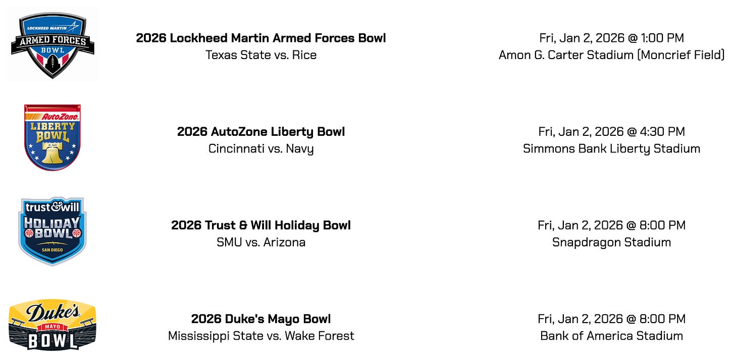 In this edition of the AAF Newsletter, we preview the final bowl game matchups of the season with NFL Draft Watch reports for every school in action amongst the four games on tap for Friday, scheduled as follows: