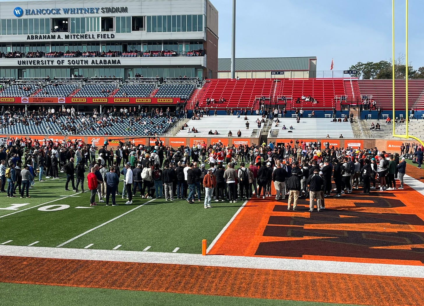 The American Team practice featured great competition at quarterback with Jalen Milroe of Alabama, Jaxson Dart of Mississippi and Riley Leonard of Notre Dame practicing side-by-side. However, the talent in the trenches was intense, as small school standout Carson Vinson of Alabama A&M stood tall against top-caliber competition, while mammoth defensive tackles Deone Walker of Kentucky and Cam’Ron Jackson of Florida are two of the more imposing figures in Mobile.
